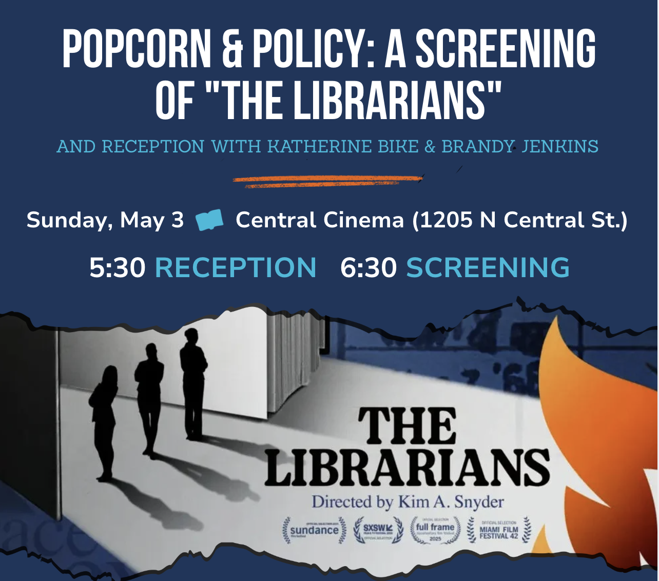 Join us May 3 at Central Cinema for a powerful night of film, community, and action as we screen The Librarians and rally support for Democratic School Board candidates Katherine Bike & Brandy Jenkins.